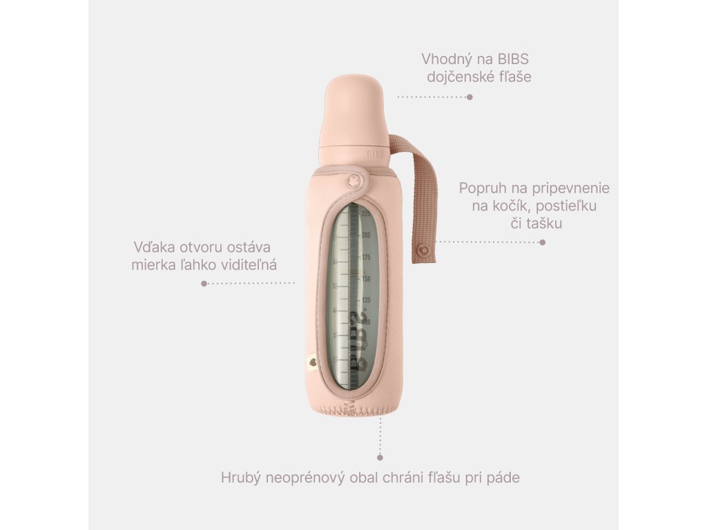 BIBS obal na fľašu je praktickým doplnkom, vďaka ktorému si môžete jednoducho vziať fľašu BIBS kamkoľvek idete. Pevný popruh poslúži na uchytenie fľaše na kočíku, taške či postieľke. Vďaka praktickému otvoru na prednej strane je mierka fľaše ľahko viditeľná.