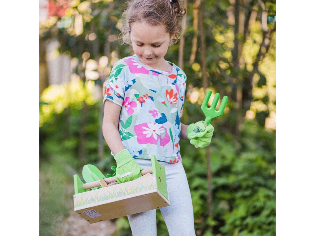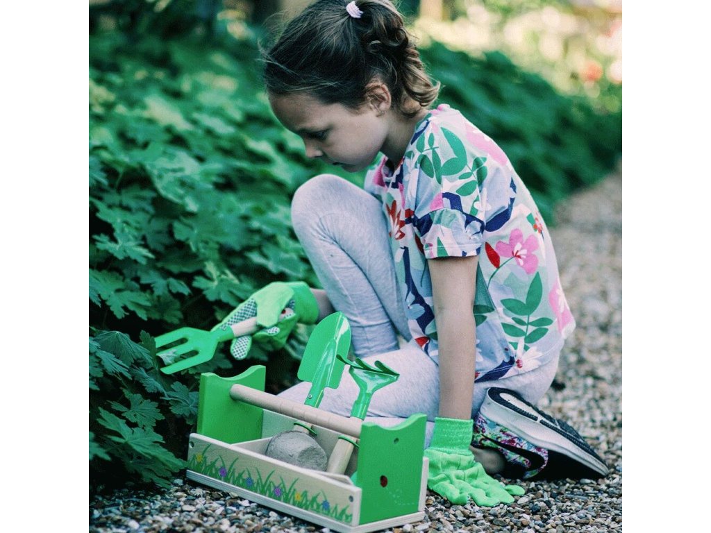 Náradie vždy po ruke všetkým malým záhradníkom a záhradníčkam. S touto súpravou si deti na záhrade užijú množstvo zábavy. Môžu pritom objavovať prírodný kolobeh a pomôcť s prácou rodičom. Súprava je vyrobená z vysoko kvalitného dreva. Je zdobený pestrú zelenú farbu s dizajnom lienok a kvetiniek.