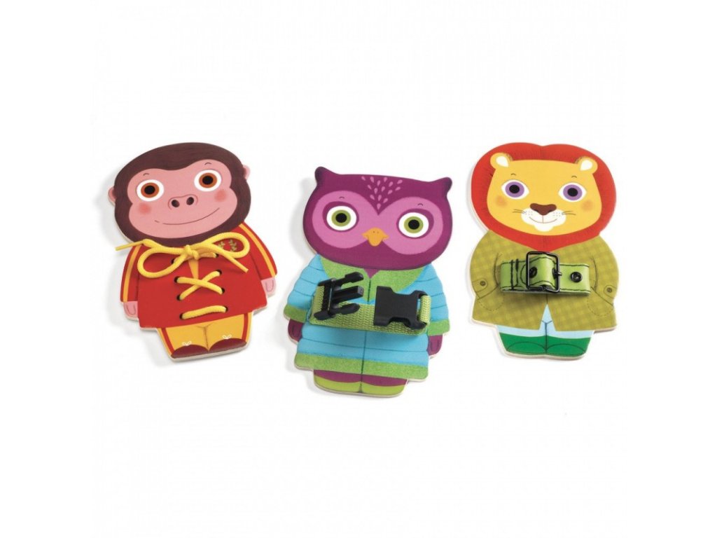 Drevená edukačná hračka určená na nácvik troch spôsobov zapínania. Zvieratkám treba pomôcť zapnúť kabát: levovi opaskom na pracku, sove opaskom na sponu a šimpanzovi uviazaním šnúrky.