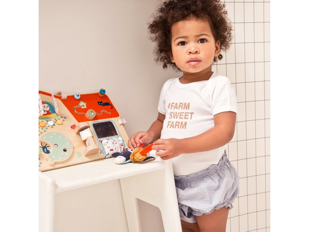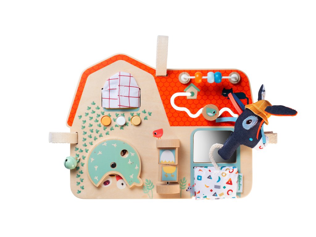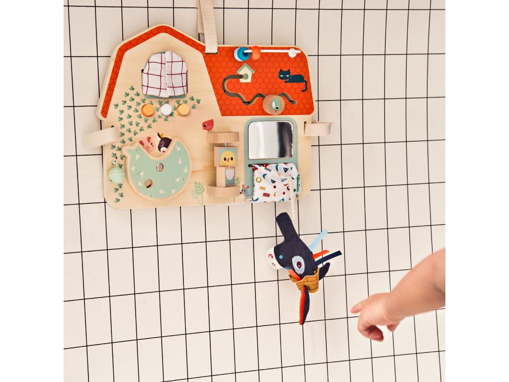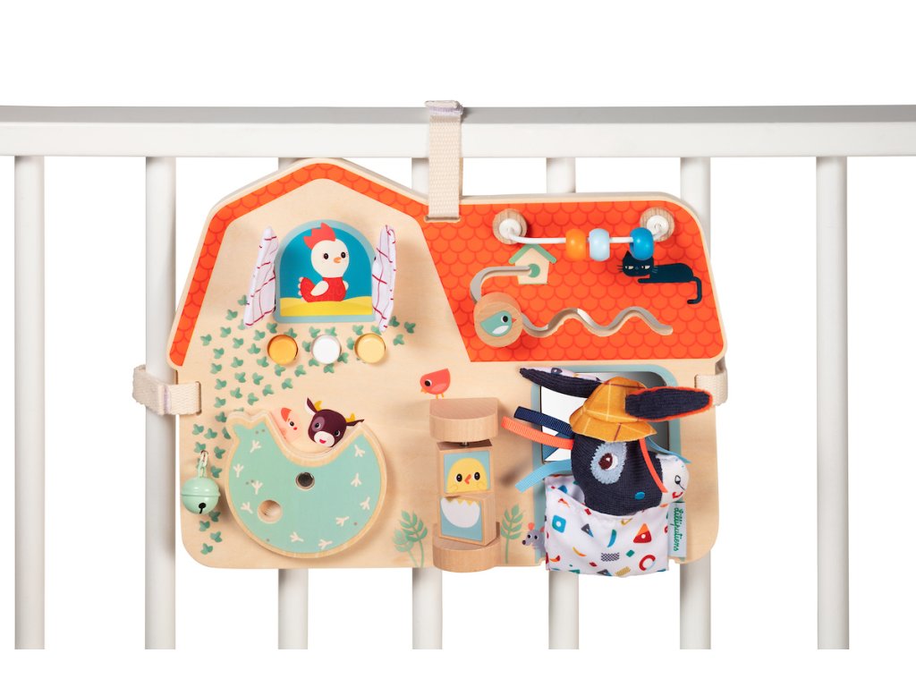 Tento drevený panel v tvare farmy ponúka množstvo aktivít a materiálov, ktoré najmenším deťom pomáhajú objavovať svet okolo seba. Podľa nádherných ilustrácií môže mamička rozprávať príbeh o oslíkovi a jeho kamarátoch na farme. Drevený panel možno vďaka pásikom na suchý zips zavesiť napr. na postieľku. Deti sa tak pohodlne môžu hrať a zároveň rozvíjať jemnú motoriku a zmysly. Panel je vyrobený z kvalitného dreva, textilné časti sú zo 100 % polyesteru a možno ich prať v práčke na 30 °C na jemný cyklus. Ideálny vek pre hru s touto hračkou je od 9 mesiacov. Rozmery panelu sú 30 x 23 cm.