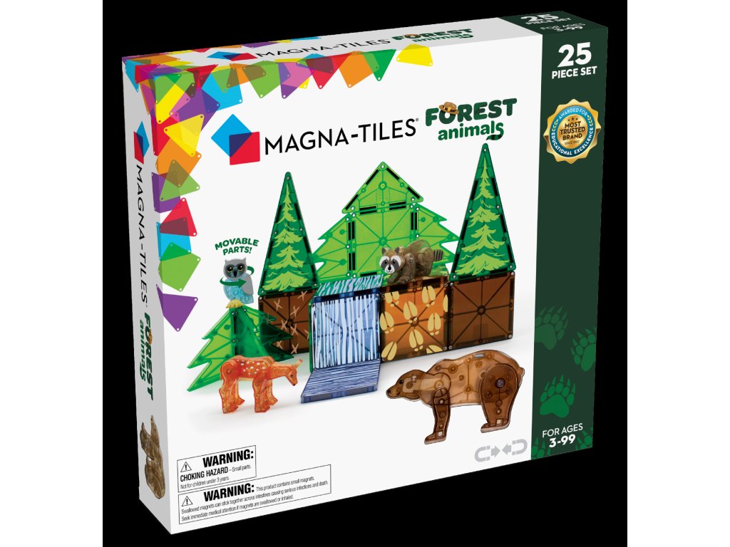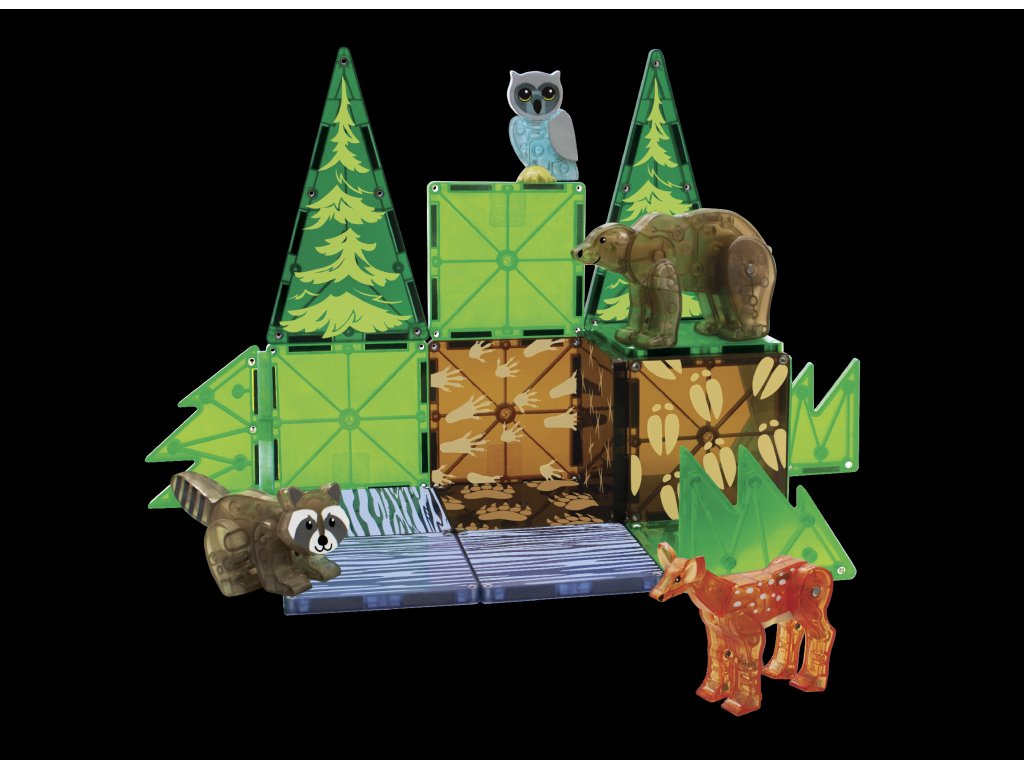 Preskúmajte záhadnú lesnú divočinu s lesnými zvieratkami, ktoré sa spolu zabávajú medzi vysokými stromami. Spriatelíte sa s medvedíkom čistotným, sovou, medveďom aj jeleňom. Táto sada obsahuje vôbec prvé magnetické listy a stromy a všetky dieliky majú nádherné realistické detaily. Jedinečné figúrky zvieratiek podporujú nápaditú hru a rozvíjajú detskú kreativitu. Stavebnica je plne kompatibilná so všetkými Magna-Tiles® sadami, čo zabezpečuje ešte viac tvorivej zábavy.