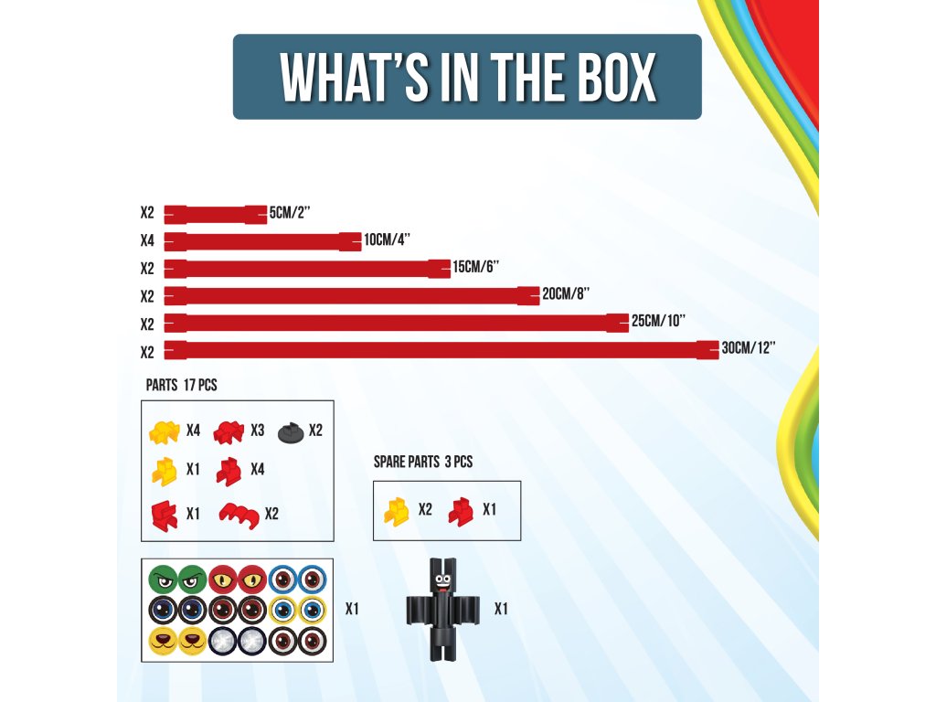 Kreatívna a flexibilná stavebnica pre deti Spaghetteez 34 ks od belgickej značky Clics Toys prináša neobmedzené možnosti tvorby a umožňuje deťom vytvoriť najrôznejšie 2D aj 3D figúrky. Balenie obsahuje rôzne dĺžky flexibilných dielikov v červenej farbe, ktoré pripomínajú špagety, spolu s ďalšími konštrukčnými prvkami a návodom na tvorbu úžasných modelov. Vďaka špeciálnemu zaklikávaciemu systému na koncoch sa dieliky ľahko spoja – stačí ich spojiť, otočiť a môžete ich začať ohýbať a modelovať.