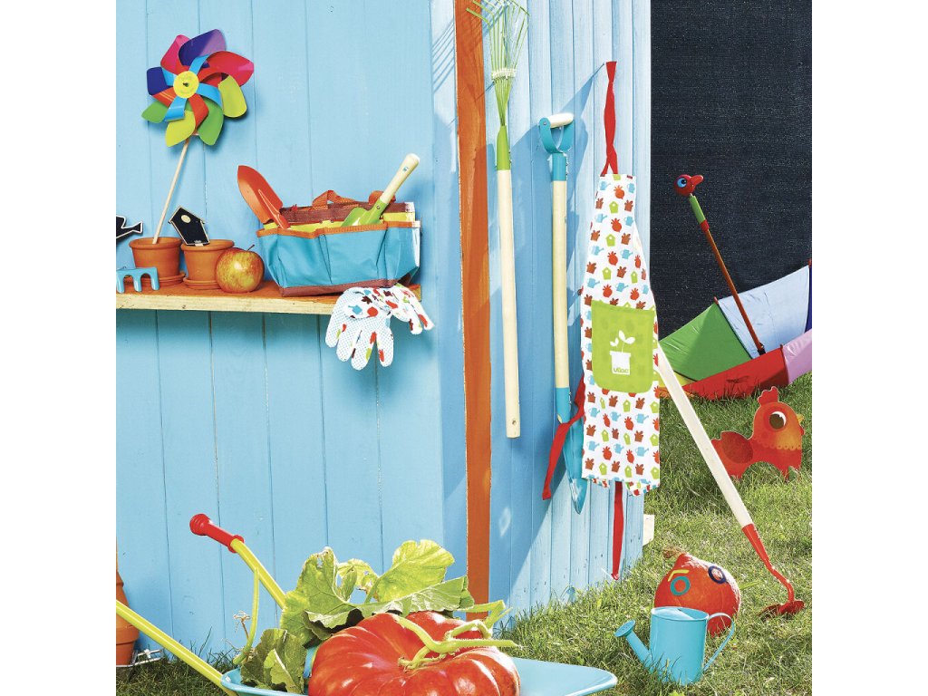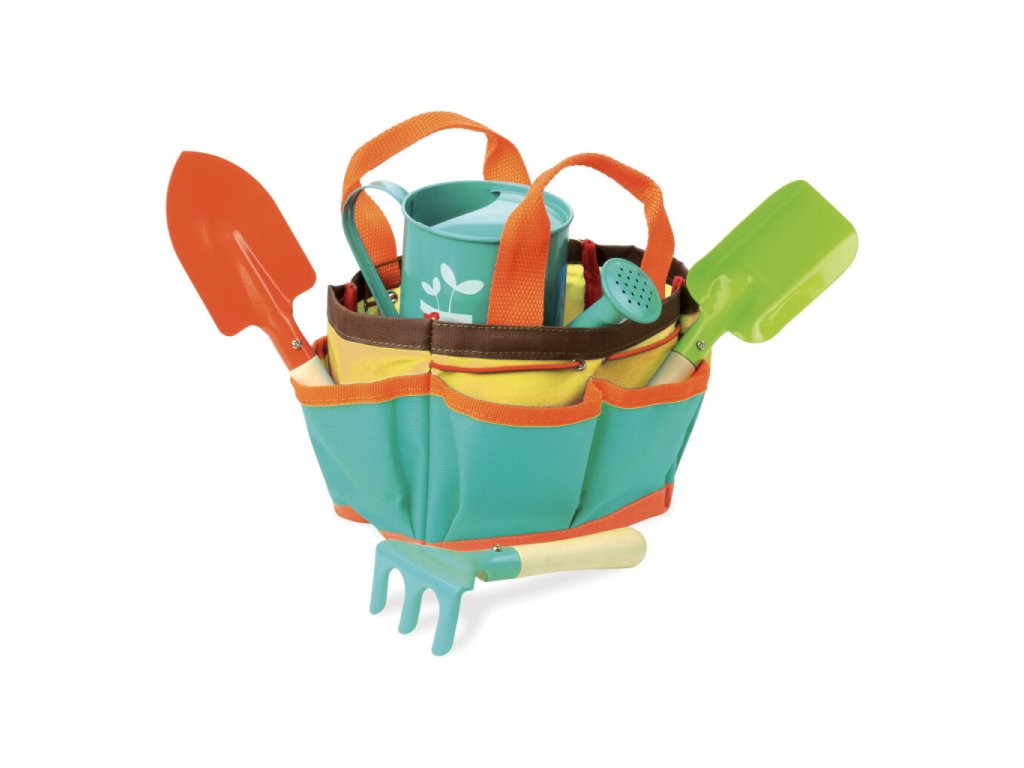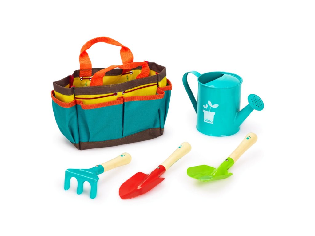 Prenosný set malých záhradníkov. Tento veľmi kvalitný záhradnícky set obsahuje lopatku, hrable, rýľ a kanvičku. Taška sa dá jednoducho vyprať, náradie umyť vodou. Náradie je vyrobené z masívneho dreva a kovu, veľkostne tak akurát pre detské ruky. Poďme na záhradu!